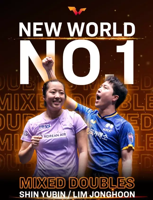 2月11日,世界乒乓球职业大联盟(WTT)官方更新社媒晒出海报,祝贺韩国混双组合申裕斌/林钟勋登顶混双世界排名第一。